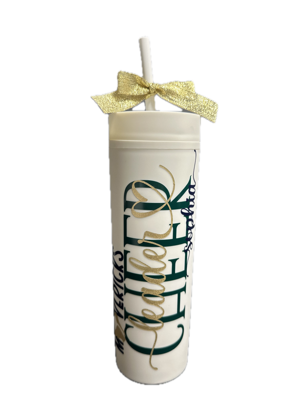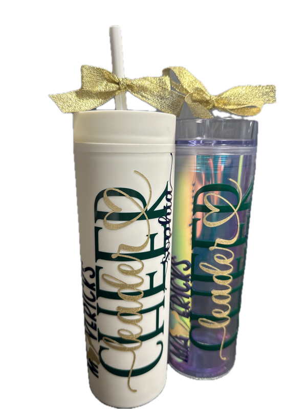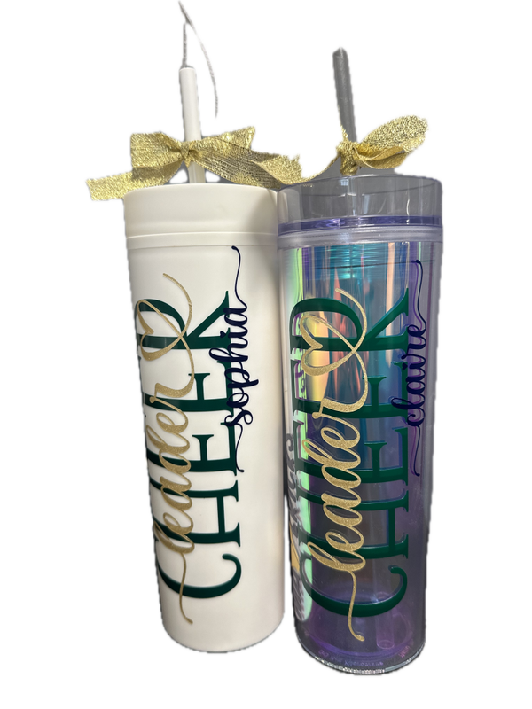 You logo or choice of custom wording on a 16 oz. white (recommended) or iridescent beverage tumbler w/ straw